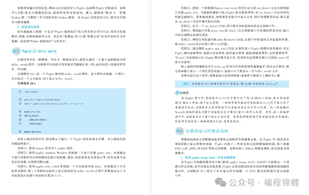 第3单元是游戏编程,安排了4个课程,讲授使用 Pyglet类库编写游戏程序。首先是学习 Pyglet编程基础,然后安排了3个趣味游戏项目,分别是公主迎圣诞、疯狂摩托和捕鱼达人。让初学者通过编写游戏程序进行编程实践,以“玩中学”的形式巩固编程知识。