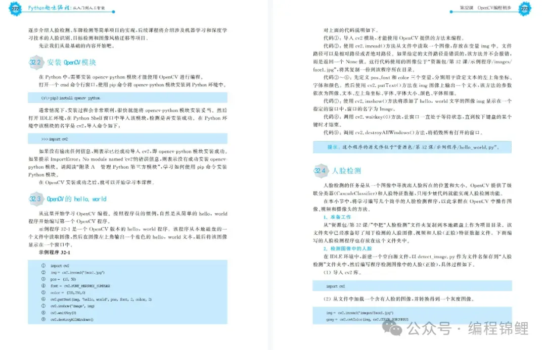 第4单元是人工智能,安排了4个课程,讲授使用OpenCV类库编写人工智能技术应用项目。首先学习OpenCV编程基础,然后安排了3个体验性质的编程项目。分别是人脸识别、目标检测和绘画大师。让初学者通过人工智能技术的应用,消除人工智能技术的神秘感。