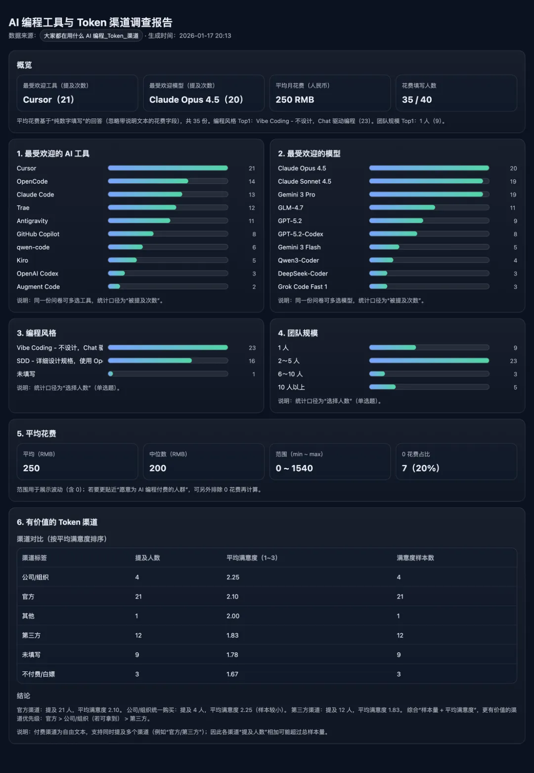 我们发起了一个关于 AI 编程工具的调查,包括 AI 编程工具、Token 渠道、模型等方面,收集了 40 份问卷数据。