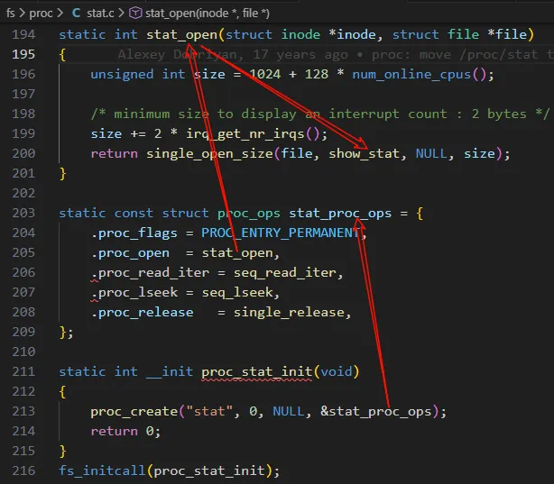 /proc/stat 伪文件的地方,可以看到主要实现在函数 show_stat 中。