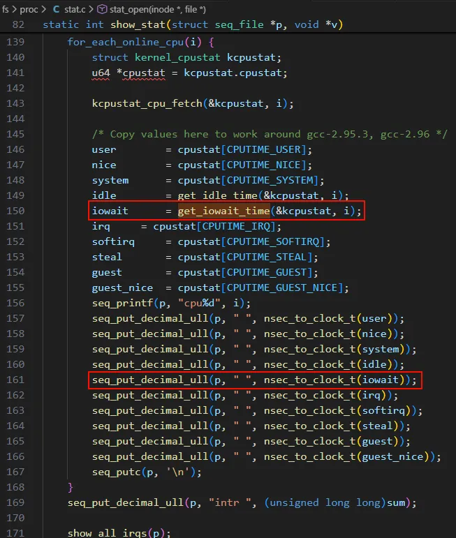 /proc/stat 中的数据完全来自 Linux 内核的内部计数器,由内核在运行时动态统计和更新。下面让我们深入 Linux 内核源代码层面,看看 iowait 具体是怎么来的