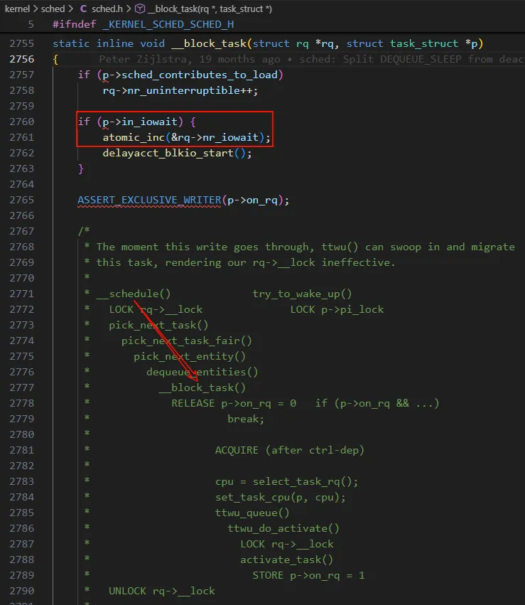 __block_task 的代码可以看出,如果当前进程的 in_iowait 非 0,则把当前 CPU