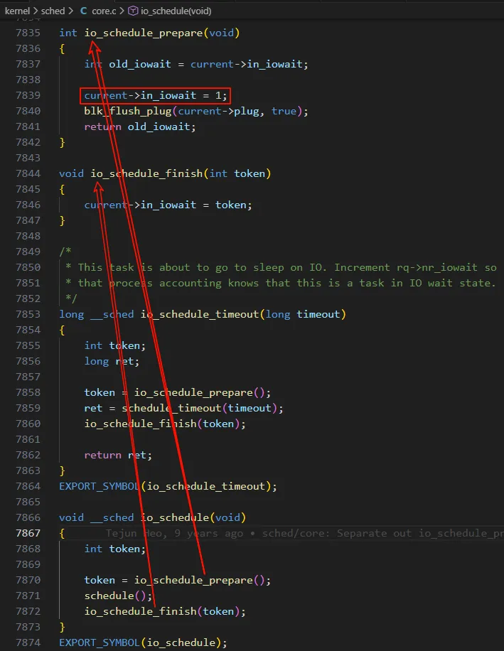 上面的分析是倒着从 /proc/stat 的实现一步一步分析出来 iowait 的值是怎么来的,下面我们正向叙述一遍。首先是进程在需要等待 I/O 的时候,要调用(主要是内核在关键路径上调用的)函数 io_schedule 或者