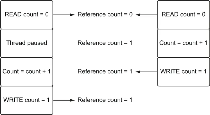 如图 1.6 所示,如果两个线程同时增加引用计数,我们可能会面临这样一种情况:一个线程导致引用计数为零,而该对象仍在被另一个线程使用。这可能导致的结果是,当我们尝试读取可能已删除的内存时,应用程序崩溃。