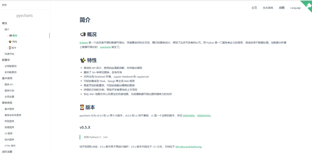 echarts由百度团队开发,因此官网拥有丰富的中文教程:https://pyecharts.org