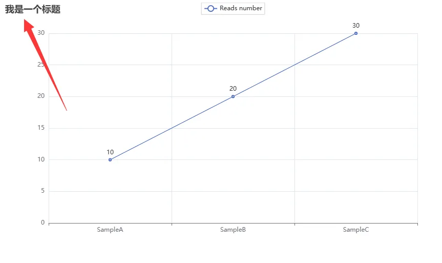 from pyecharts.charts import Line# 得到折线对象my_line = Line()print(type(my_line))## <class 'pyecharts.charts.basic_charts.line.Line'># 添加X轴数据my_line.add_xaxis(["SampleA","SampleB","SampleC"])# 添加y轴数据## <pyecharts.charts.basic_charts.line.Line object at 0x000001AFF3AABD68>my_line.add_yaxis("Reads number",[10,20,30])# 渲染并生成图表## <pyecharts.charts.basic_charts.line.Line object at 0x000001AFF3AABD68>my_line.render()## 'F:\\公众号\\Python学习\\render.html'得到图表如下:
