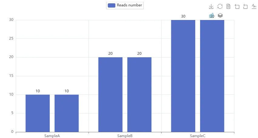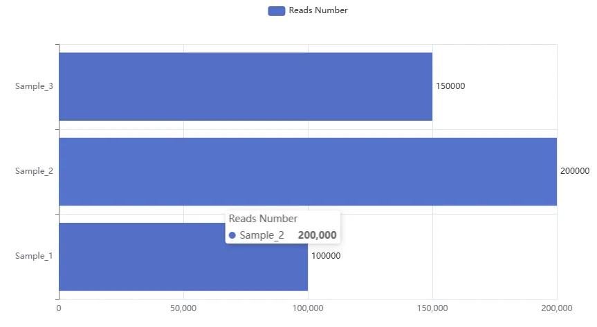 # 基础柱状图from pyecharts.charts import Barfrom pyecharts.options import LabelOpts# 构建柱状图对象bar = Bar()# 添加X轴数据:bar.add_xaxis(["Sample_1","Sample_2","Sample_3"])# 添加y轴数据:## <pyecharts.charts.basic_charts.bar.Bar object at 0x000001AFF51C7630>bar.add_yaxis("Reads Number",[100000,200000,150000], label_opts=LabelOpts(position="right") )## <pyecharts.charts.basic_charts.bar.Bar object at 0x000001AFF51C7630>bar.reversal_axis()# 绘图## <pyecharts.charts.basic_charts.bar.Bar object at 0x000001AFF51C7630>bar.render("基础柱状图.html")## 'F:\\公众号\\Python学习\\基础柱状图.html'可以看到数字的位置被改变
