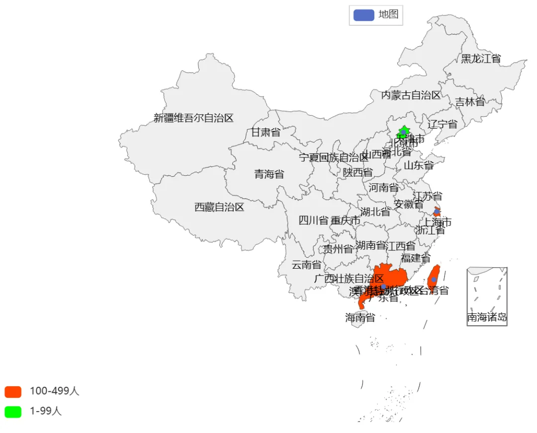 # 修改图例:from pyecharts.charts import Mapfrom pyecharts.options import VisualMapOptsmap= Map()my_data = [ ("北京市", 99), ("上海市", 199), ("湖南市", 299), ("台湾省", 399), ("广东省", 299)]map.add("地图",my_data,"china")## <pyecharts.charts.basic_charts.map.Map object at 0x000001AFF51D9358>map.set_global_opts(visualmap_opts = VisualMapOpts( is_show=True, is_piecewise=True, pieces = [ {"min":1,"max":99,"label":"1-99人","color":"#00FF00"}, {"min":100,"max":499,"label":"100-499人","color":"#FF4500"} ]))## <pyecharts.charts.basic_charts.map.Map object at 0x000001AFF51D9358>map.render()## 'F:\\公众号\\Python学习\\render.html'得到有颜色分布及图例的地图结果: