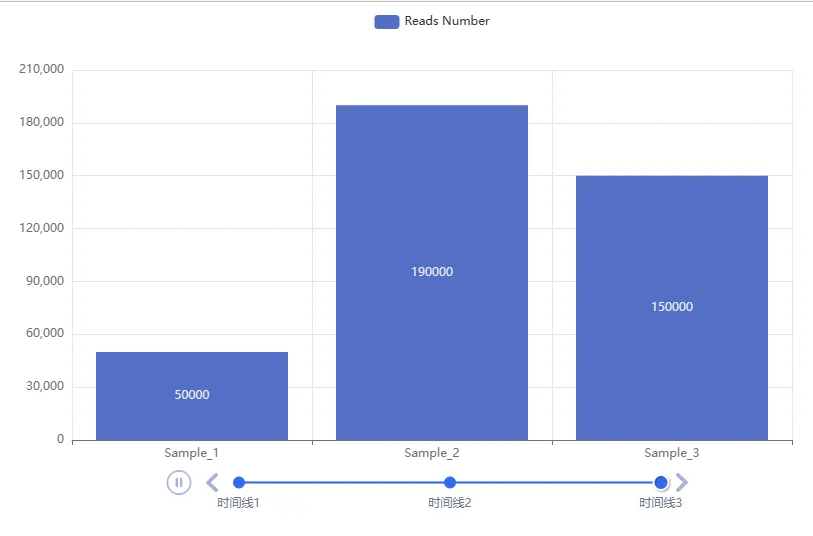 # 基础柱状图from pyecharts.charts import Bar,Timelinefrom pyecharts.options import*# 构建第一个柱状图对象bar_1 = Bar()bar_1.add_xaxis(["Sample_1","Sample_2","Sample_3"])## <pyecharts.charts.basic_charts.bar.Bar object at 0x000001AFF51D2AC8>bar_1.add_yaxis("Reads Number",[100000,200000,150000])## <pyecharts.charts.basic_charts.bar.Bar object at 0x000001AFF51D2AC8>bar_2 = Bar()bar_2.add_xaxis(["Sample_1","Sample_2","Sample_3"])## <pyecharts.charts.basic_charts.bar.Bar object at 0x000001AFF51D2DA0>bar_2.add_yaxis("Reads Number",[160000,250000,170000])## <pyecharts.charts.basic_charts.bar.Bar object at 0x000001AFF51D2DA0>bar_3 = Bar()bar_3.add_xaxis(["Sample_1","Sample_2","Sample_3"])## <pyecharts.charts.basic_charts.bar.Bar object at 0x000001AFF51DA0F0>bar_3.add_yaxis("Reads Number",[50000,190000,150000])# 创建时间线对象## <pyecharts.charts.basic_charts.bar.Bar object at 0x000001AFF51DA0F0>timeline = Timeline()timeline.add(bar_1,"时间线1")## <pyecharts.charts.composite_charts.timeline.Timeline object at 0x000001AFF51DA400>timeline.add(bar_2,"时间线2")## <pyecharts.charts.composite_charts.timeline.Timeline object at 0x000001AFF51DA400>timeline.add(bar_3,"时间线3")# 绘图## <pyecharts.charts.composite_charts.timeline.Timeline object at 0x000001AFF51DA400>timeline.render("时间线柱状图.html") # render宣传出图时可以指定文件名## 'F:\\公众号\\Python学习\\时间线柱状图.html'这时候就得到了一个底部具有时间线轴的柱状图,可以自由的选择时间线进行展示,并且自动播放