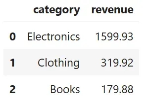 ( pd.read_csv("sales.csv") .query("region == 'West'") .assign(revenue=lambda d: d["units"] * d["price"]) .groupby("category", as_index=False)["revenue"].sum() .sort_values("revenue", ascending=False) .reset_index(drop=True))这样会得到同样的结果。