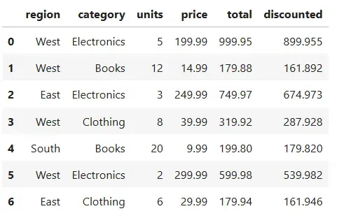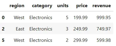 west = df[df["region"] == "West"].copy()west["revenue"] = west["units"] * west["price"]现在,west 是一个独立的 DataFrame。但是请注意嵌套括号的笨拙语法(df[df[“region”])。它既不方便又难以阅读。