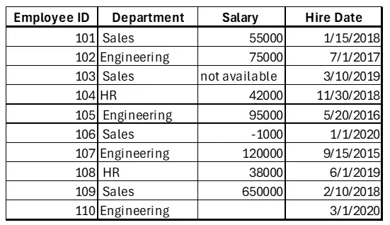 为了强调我们目前所学的内容,让我们使用方法链来修复一个小型且混乱的员工数据集。输入的 CSV 文件存在列名混乱、缺失值、数据类型混杂、冗余空格以及异常值(例如负薪资和远高于其他薪资的薪资)等问题。