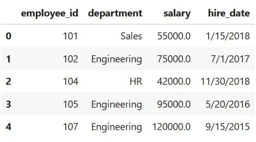 import pandas as pdclean = ( pd.read_csv("employees.csv") # 1. 清洗列名: .rename(columns=lambda c: c.strip().lower().replace(" ", "_")) # 2. 修复数据类型并去除空格: .assign( salary=lambda d: pd.to_numeric(d.salary, errors="coerce"), department=lambda d: d.department.str.strip() ) # 3. 删除薪水为空或无效薪水的行: .dropna(subset=["salary"]) .query("salary > 0") # 4. 移除极端异常值 (薪水 top 1%): .pipe(lambda d: d[d.salary < d.salary.quantile(0.99)]) # 5. 最后对清洗结果重置索引(恢复默认索引): .reset_index(drop=True))clean.head()以下是清洗后的 DataFrame 的前五行:
