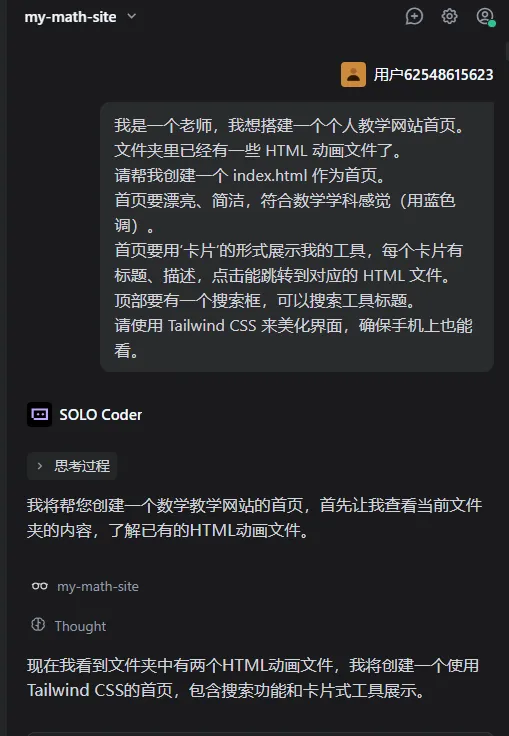 在 AI 技术爆发的今天,教育正在发生一场静悄悄的变革。以前,想要搭建一个属于自己的教学网站,老师们需要学习复杂的 HTML 代码、购买服务器、配置域名,往往折腾几天也搞不定。但现在,只要你愿意尝试,借助 AI 工具 Trae 和国内好用的托管平台 Gitee,哪怕零基础,你也能在 10 分钟内变身“极客老师”,搭建出一个既美观又实用的数学课件导航站。安装工具:下载并安装 Trae(或者 Cursor)。创建文件夹:在电脑桌面创建一个文件夹,起名叫 my-math-site。放入你的动画:把你之前做好的 HTML 动画文件丢进去。比如你有一个 dice.html(骰子)和一个 circle.html(圆面积)。在 Trae 中打开:打开 Trae,点击 Open Folder,选中刚才创建的 my-math-site 文件夹。在 Trae 的界面右侧(或者按 Ctrl+I / Cmd+I 唤醒对话框),切换到 Builder 模式(这是专门用来写项目的模式),然后直接复制下面这段话发送给它,现在Trae有Solo模式也很好用:首页要用‘卡片’的形式展示我的工具,每个卡片有标题、描述,点击能跳转到对应的 HTML 文件。请使用 Tailwind CSS 来美化界面,确保手机上也能看。”生成代码:Trae 会自动思考,然后开始写代码。你会看到它创建了 index.html 和一个 config.js(用来存工具列表的文件)。点击接受:当它写完后,代码上方会出现 Accept(接受)按钮,点击它,文件就会保存到你的文件夹里。第四步:预览效果