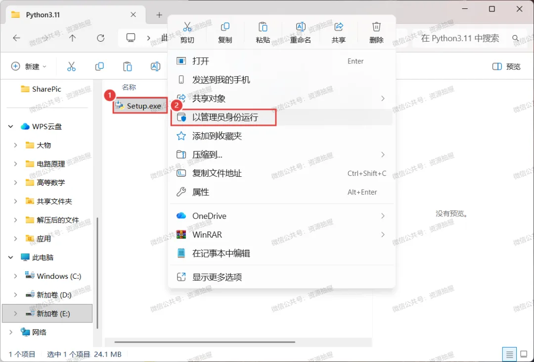 5.鼠标左键选中[Setup.exe],再右键选择[以管理员身份运行]