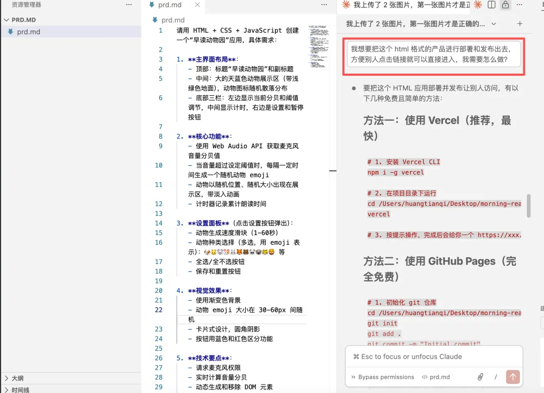 聊到普通人用 AI 做产品,想必大家都是不知道如何开始实操,对做产品这件事的第一印象也是这几个关键词:代码、Python 语言、天书、一头雾水等等。在 AI 发展到 2026 年这个视角,我想和你分享一个我最近的体感,今天即使是 0 编程计算机基础的普通人,也能借助 AI 编程做出一些轻量化的产品,且从产品的部署到上线发布,大部分一个人也能搞定。今天和大家分享一个我昨天做出来的 AI 小产品,从完整用到的需求构思到发布全流程,照着做,你也能完整做出来。 保姆级实操教程,建议收藏再看。这个产品是针对老师群体早自习早读场景,学生不愿意开口朗读的痛点,通过趣味化游戏化的方式激发学生朗读积极性,帮助老师进行管理上的减负。产品场景:检测到早读声音,画面上的动物就会越来越多,直到铺满整个屏幕。当声音减弱或者停止,屏幕上的动物就会越来越少,直至消失。一、准备一个 AI 对话工具