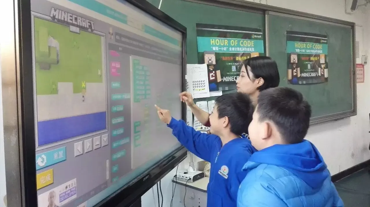 推开教室门,他们看到的是 23 个九岁左右的孩子。接下来的一个小时,他们将和这些孩子沉浸在一款可视化编程游戏《我的世界》(Minecraft)。