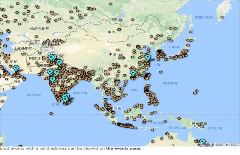 其中密度较高的地区为美国和欧洲。(黄色圆点代表常规的“编程一小时”活动,蓝色定位标为特别企划活动)
