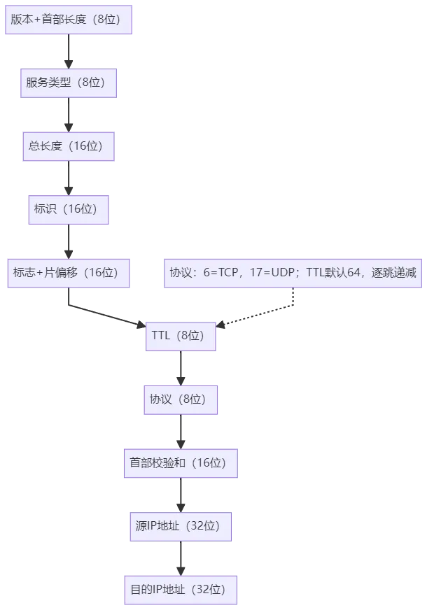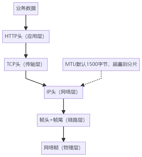 3. 网络层:依据RFC 791标准添加IP头,固定首部20字节,包含源IP、目的IP、TTL(生存时间)、协议类型(标识上层为TCP/UDP)等字段,形成IP数据包,IP协议通过分片机制适配不同链路MTU。IP头格式如下:4. 网络接口层:通过ARP协议(RFC 826)解析下一跳MAC地址,添加帧头(含源/目的MAC)与帧尾(CRC校验码),形成符合以太网规范的网络帧,帧校验码用于验证传输过程中数据是否损坏;以TCP协议为例,数据封装的层级结构与协议头添加逻辑可通过以下mermaid图具象化,同时需关注最大传输单元(MTU):