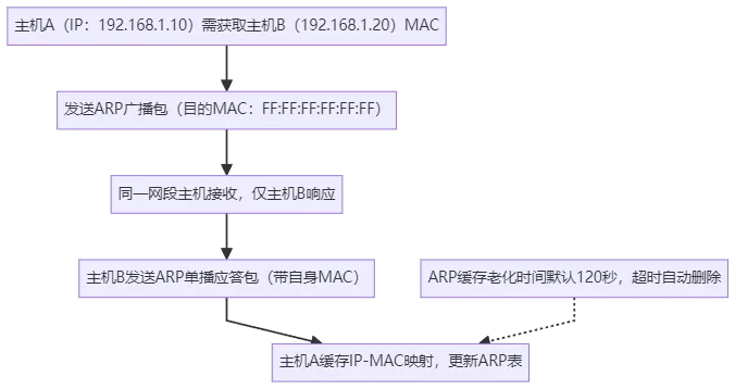 网络接口层依据RFC 826执行ARP查询,获取下一跳MAC地址(若缓存中无对应条目则发送ARP广播),添加帧头帧尾(含CRC校验码),将网络帧放入发包队列,通过软中断通知网卡驱动,确保帧格式符合链路传输标准。ARP工作流程如下: