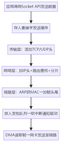 应用程序调用Socket API(如sendmsg)发送数据,陷入内核态的套接字层,数据被存入套接字发送缓冲区;