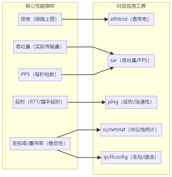 核心性能指标的关联逻辑及观测工具对应关系,可通过以下mermaid图梳理,便于快速定位指标与工具的匹配场景: