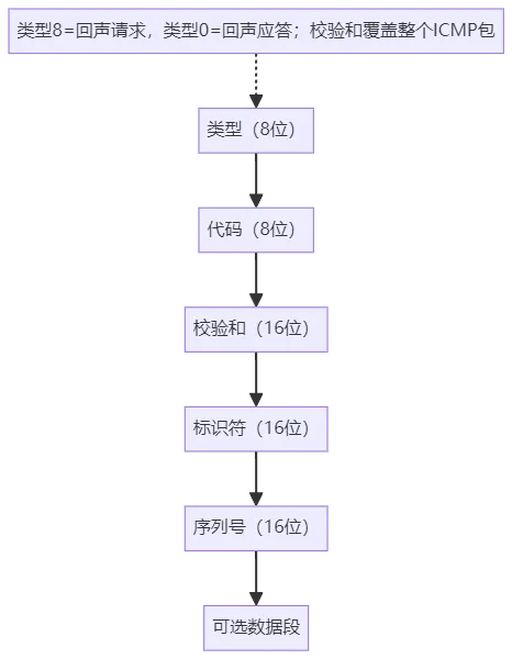 ping -c3 114.114.114.114:基于ICMP协议(RFC 792)的回声请求/应答机制,测试网络连通性与RTT(往返延时),输出丢包率、最小/平均/最大延时,其中ICMP回声包不承载应用数据,仅用于网络可达性与延时探测,是快速排查网络连通性的首选工具。补充实操细节:Linux中ping命令默认发送ICMP回声请求包(类型8,代码0),目标主机回复回声应答包(类型0,代码0);若需指定包大小,可使用ping -s 1024 目标IP(发送1024字节数据的ICMP包),需注意包总大小(数据+ICMP头+IP头)不超过MTU,否则会触发分片。此外,部分网络设备会禁止ICMP包通过,导致ping不通但业务正常,此时可通过telnet 目标IP 端口或nc -zv 目标IP 端口测试端口连通性。ICMP回声包格式如下:
