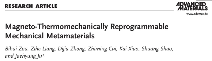 面向可重构结构应用的下一代主动式超材料,需具备响应迅速、无缆操控、可逆形变、可编程(多模态)变形能力,同时还需拥有形状锁定特性。在各类驱动调控方式中,磁控技术凭借响应速度快、可实现远程操控驱动的优势脱颖而出,但该技术存在一项显著缺陷 —— 需要持续施加磁场以维持材料的变形状态,这一短板严重限制了其在结构工程领域的实际应用。形状记忆聚合物(SMPs)所具备的形状锁定特性,恰好能够弥补磁控技术的这一不足。然而,形状记忆聚合物本身存在固有不可逆性,这又会制约其作为主动式超材料的可重构性能。此外,在已有的可编程调控方案中,激光辐照、电弧焊接等技术不仅需要输入大功率能量,还存在能量利用效率低下的问题,难以满足工程化应用的需求。针对上述多重技术瓶颈,本研究构建并验证了一套磁 - 热 - 力多场耦合调控工具。该工具通过向形状记忆聚合物施加磁 - 热 - 力耦合触发的预应力,并结合非对称磁力矩诱导的结构失稳效应,成功使单一材料体系同时实现无缆操控、可逆形变、低功耗可编程变形与形状锁定四项核心功能。本研究的核心创新点在于,实现了磁控技术与形状记忆聚合物热 - 力学行为两大物理机制的协同增效,整个调控过程无需合成新型材料,也不需要输入大功率能量即可完成可编程变形。这一技术方案为主动式超材料的研发开辟了全新路径,有望推动柔性高刚度软体机器人、多模态变形结构、力学计算器件等领域的技术革新,助力相关装备实现可逆化、可编程化的设计与应用。