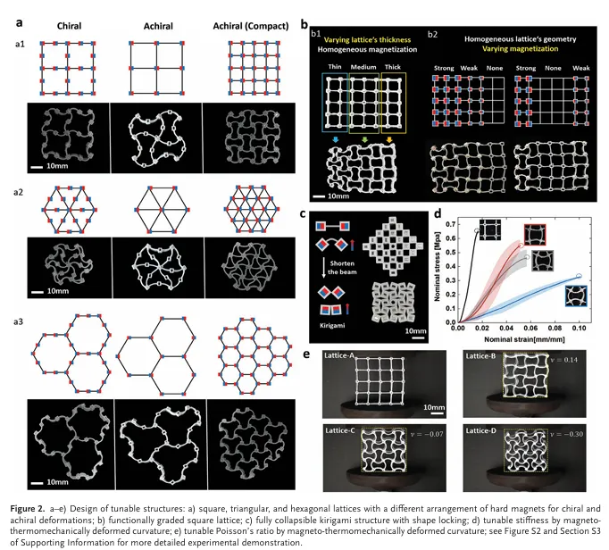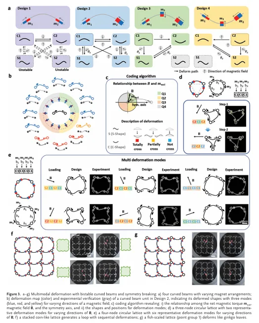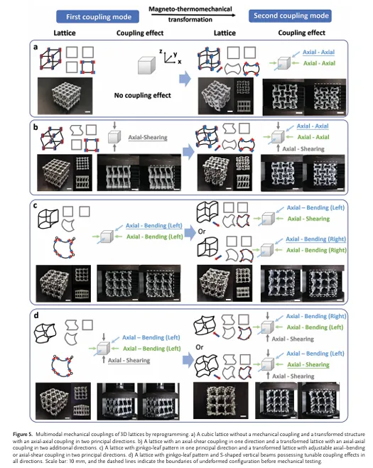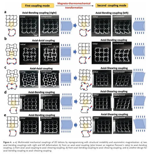 本研究证实,借助形状记忆聚合物(SMP)的温敏刚度特性,以及由磁力矩实现精准调控的预应力,能够使单一形状记忆聚合物体系具备无缆操控、可逆形变、可编程变形的能力,同时还可实现稳定的形状锁定功能。研究团队通过磁矩的非对称排布设计,结合基于结构失稳效应的构型设计与形状记忆聚合物的回复特性,让晶格结构实现多模态、多场耦合的变形响应,且整个可编程变形过程无需额外输入能量。尤为关键的是,通过对磁力矩的局部调控,该体系可实现非均匀变形,进而构筑功能梯度结构 —— 这类结构是传统形状记忆聚合物全局调控方法(如模具定型、极限机械加载)难以制备的。本研究提出的磁 - 热 - 力多场耦合设计理念,能够大幅推动下一代主动式超材料的发展进程,助力其满足可重构结构领域的严苛应用需求,即实现响应迅速、无缆操控、可逆形变、可编程(多模态)变形与形状锁定的一体化功能。这种基于多物理场耦合的技术方案,在可重构结构设计领域实现了范式革新 —— 其核心优势在于,仅依靠结构力学设计即可达成目标性能,无需合成新型材料,也无需为可编程变形过程额外投入能量。这一创新的结构设计方案,为未来智能变形材料的研发开辟了全新分支,有望推动具备可逆变形、形状保持、无缆操控与高能效可编程特性的智能机器人材料的研制,为航空航天变形结构、柔性机器人、智能防护装备等领域的技术升级提供核心支撑。