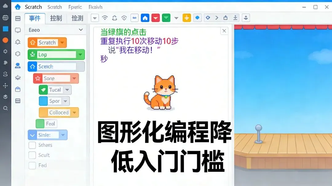 三年级的小明第一次在计算机课上接触Scratch时,屏幕上的小猫随着他设计的指令移动、旋转、发出声音。他兴奋地告诉父母:“我可以让电脑听我的话!”