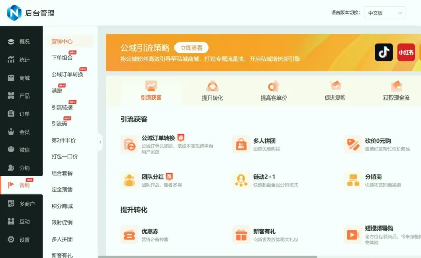 •核心优势落地:零代码门槛的同时保障功能深度,商品管理支持批量添加与规格精细化设置,订单管理可实现多维度筛选与批量处理,会员体系覆盖等级、积分、储值全链路沉淀;推广员、分销商、社区团长三类裂变模式并行,搭配拼团、砍价等营销工具,形成完整的增长闭环。