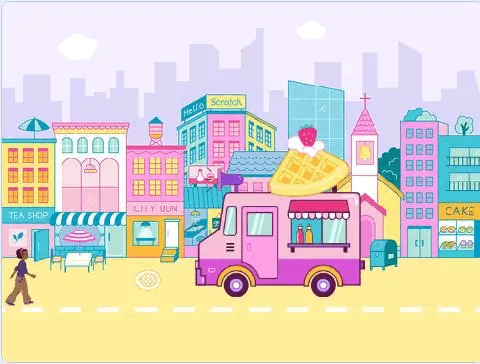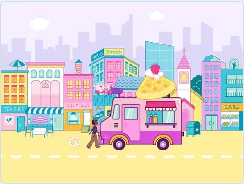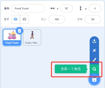 (1)删除默认小猫角色,添加角色 Food Truck 和 Avery Walking;