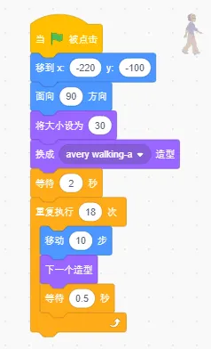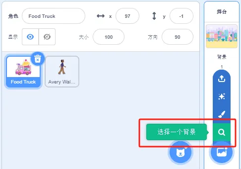删除默认小猫角色,添加角色 Food Truck 和 Avery Walking。