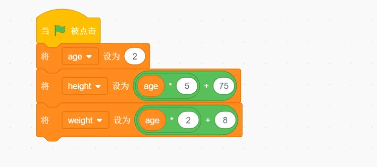 例如:age = 2时,height = 2 × 5 + 75 = 85(厘米),weight = 2 × 2 + 8 = 12(公斤)。