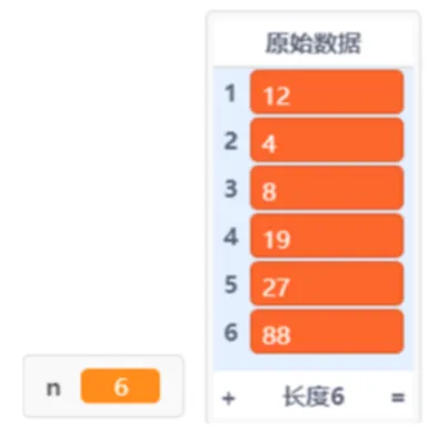 首先输入一个正整数n,并在列表【原始数据】中输入n个1~ 99 范围内的整数。