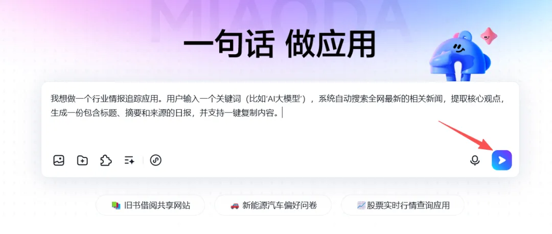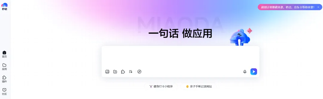 打开百度秒哒官网(或通过百度智能云进入),界面非常极其简洁,这就和搜索引擎一样,中间只有一个巨大的输入框。