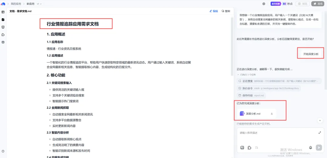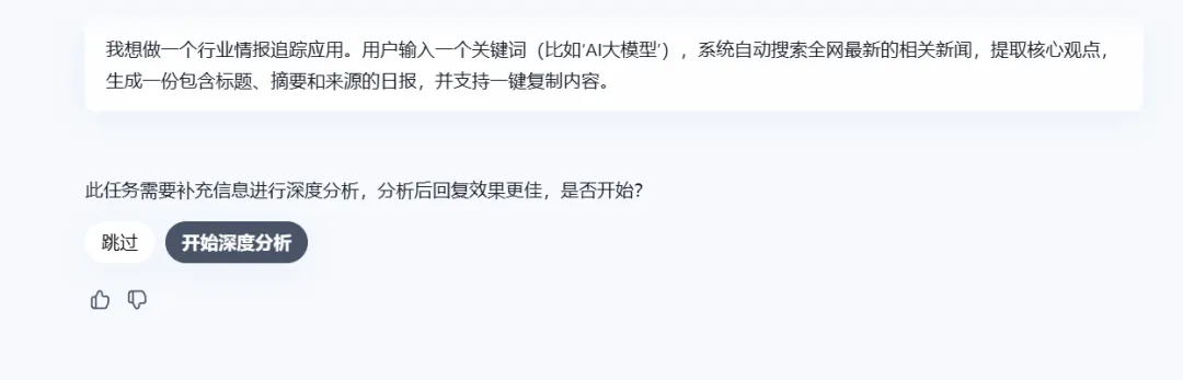 “我想做一个行业情报追踪应用。用户输入一个关键词(比如‘AI大模型’),系统自动搜索全网最新的相关新闻,提取核心观点,生成一份包含标题、摘要和来源的日报,并支持一键复制内容。”