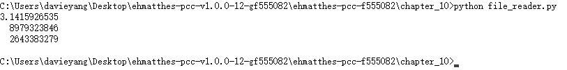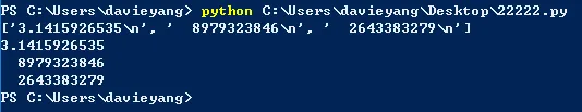 file_name = "C:/Users/davieyang/Desktop/pi_digits.txt"with open(file_name) as file_object: lines = file_object.readlines()print(lines)for line in lines: print(line.rstrip())