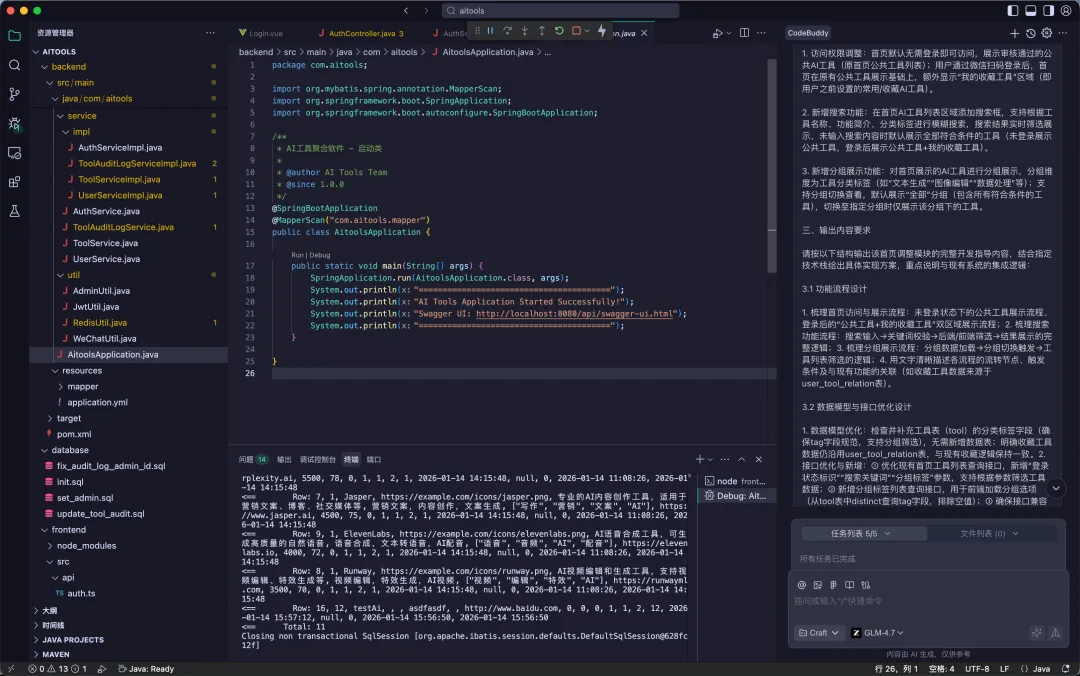 用一句话给AI说明我所需要开发的工具需求,以及所涉及到的技术栈(本次所使用的技术栈为:SpringBoot+ElementPlust+Vue3+JDK8)。AI设计好需求以及功能模块之后,让AI根据自己所熟悉的技术栈生成AI提示词方案。将第二步中AI生成好的提示词,放到CodeBuddy中,让AI开始写代码。这个时候AI会根据提示词,生成前后端代码以及对应的数据库脚本。如果你的功能有增减,则重复第二步和第三步,全部完成之后,AI会生成对应的数据库脚本,将脚本在你的数据库中进行创建对应的表结构。到这个时候,大部分工作都已经完成了,开始尝试启动项目,以及验证功能。启动过程中可能有点小问题,继续反馈给AI工具即可,他会解决。