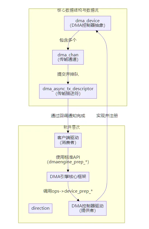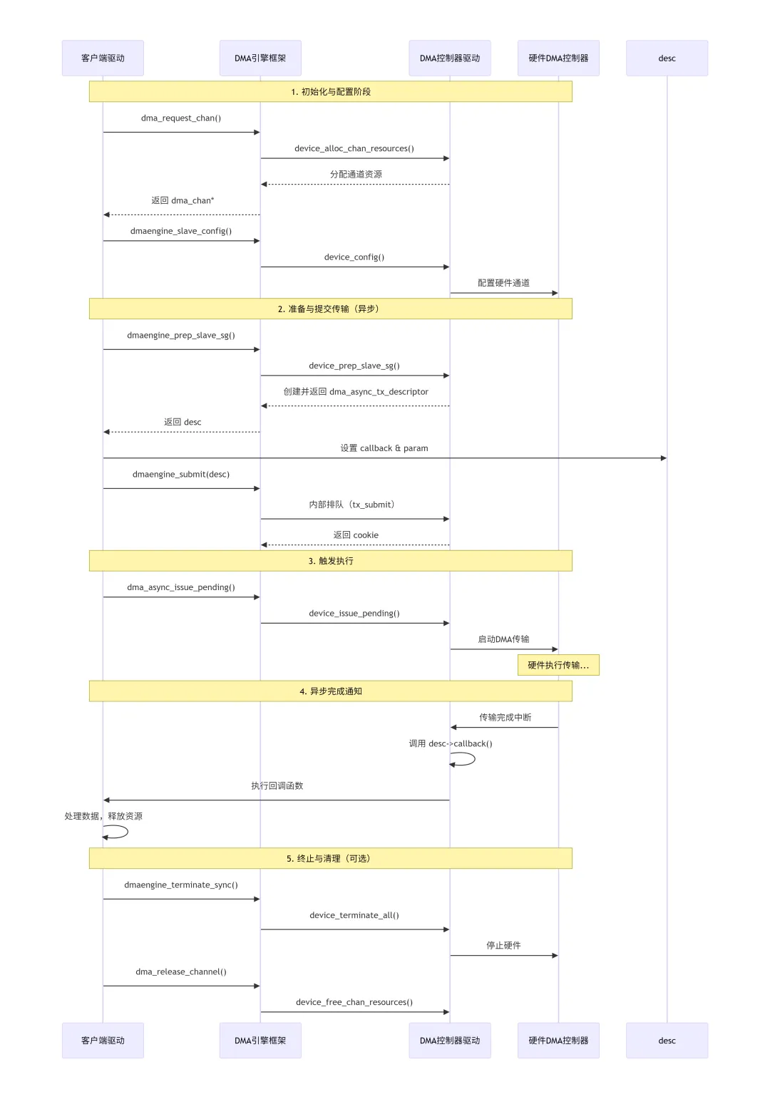 以下是使用 dmaengine 框架进行一次DMA传输的标准流程,该流程图清晰地展示了各核心数据结构如何协作以及异步回调机制: