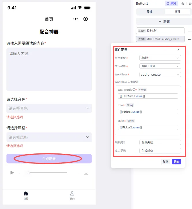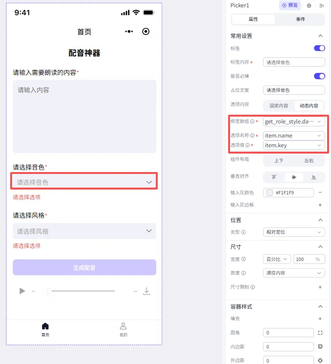 ①选择音色下拉框,绑定工作流生成的数据源;选择风格下拉框类似。