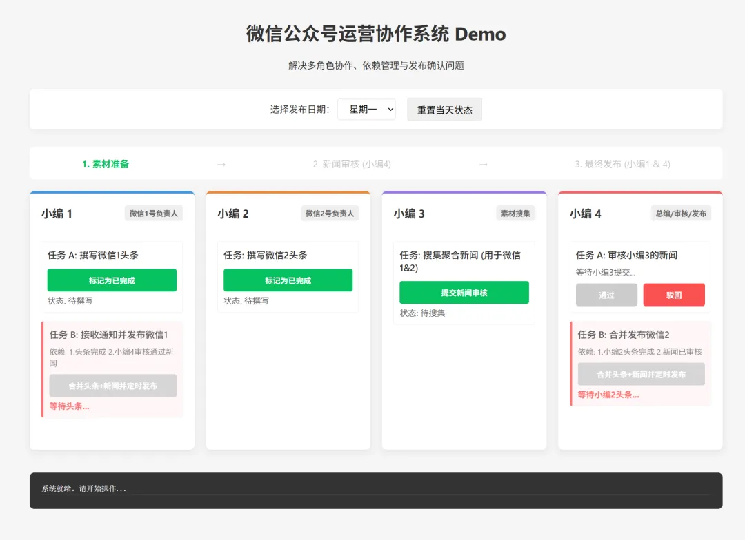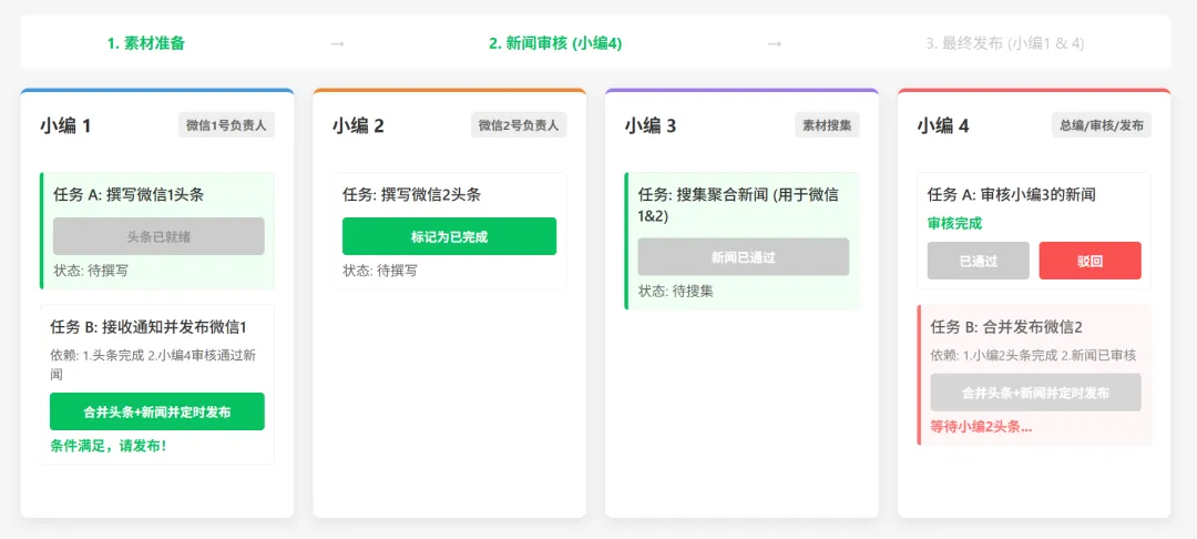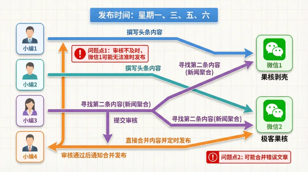 主要的问题就是,小编4,针对小号,极客果核,由于文章头条是小编2写的,所以小编4不知道小编2写的内容,第二天要发哪些,就会导致合并错文章发布。而小编4又可能忘记通知小编1已经完成新闻审核和评论,导致大号内容第二天可能没有及时发布。