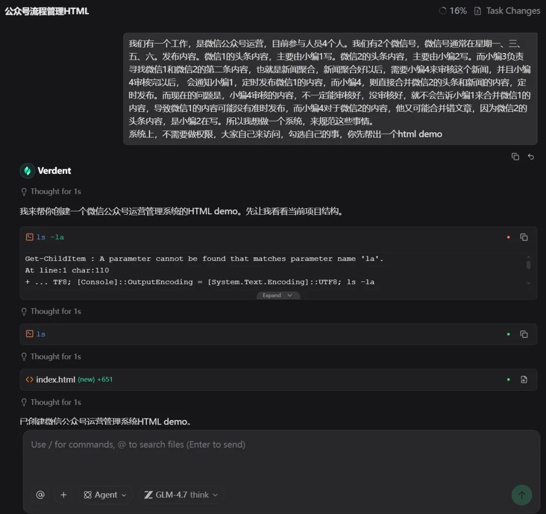 跟智谱的区别就是,智谱是任务全都是一条,而claude把要做的事,再一次细分了一下,并且加了进度和待办提示面板。