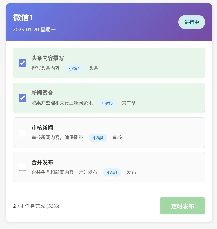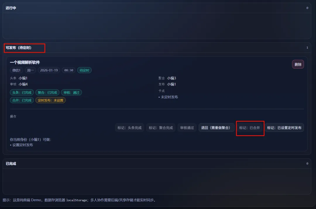 小编4审核完成以后,小编1就可以点击合并定时了。并且顶部的流程,会标注当前完成的进度。