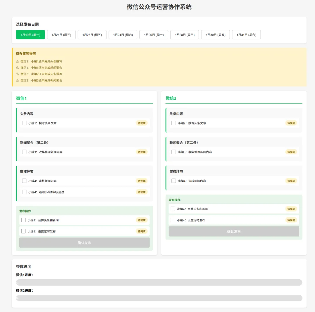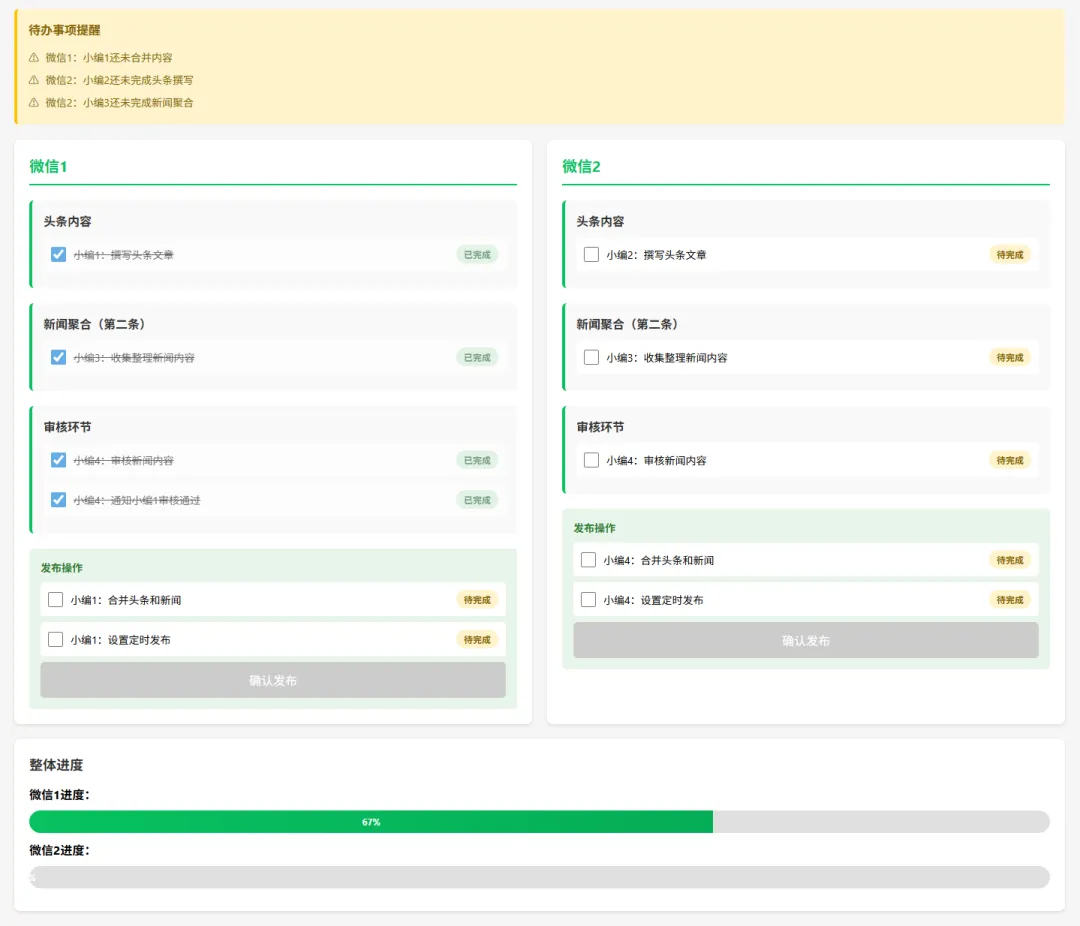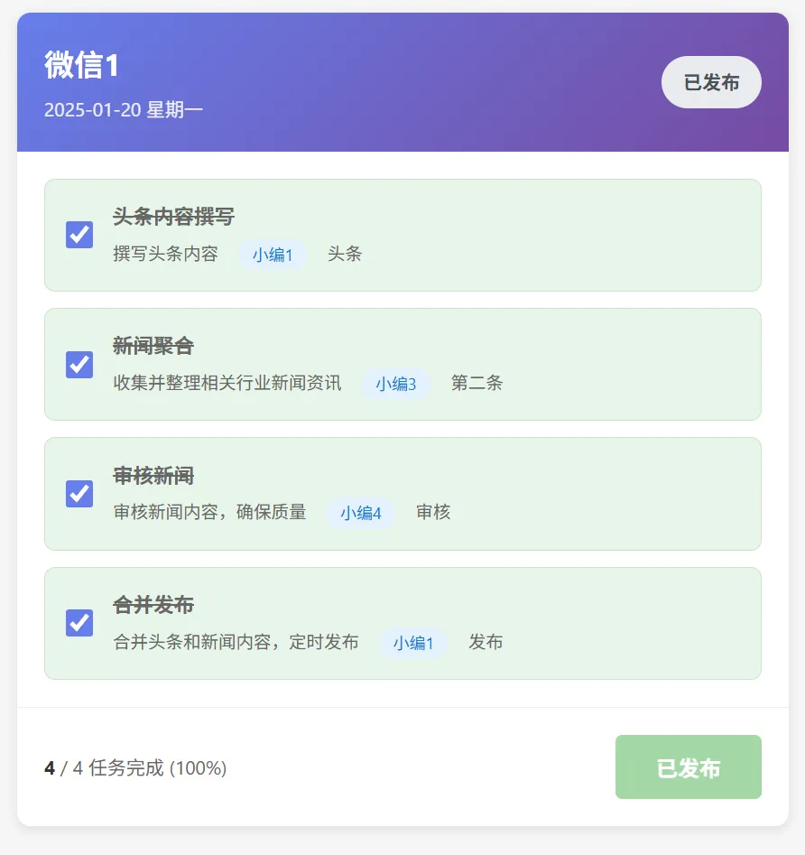 还是同样的,每个小编可以来勾选自己的任务。如果全部完成,下面的进度条会走到100%。