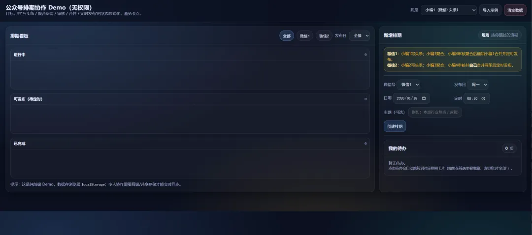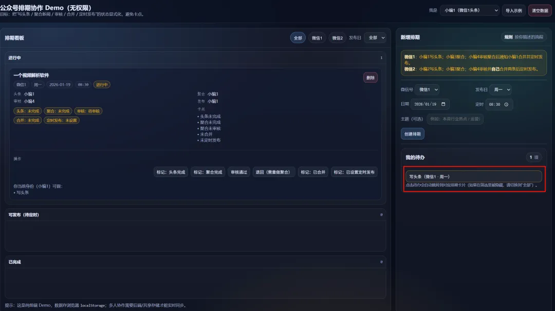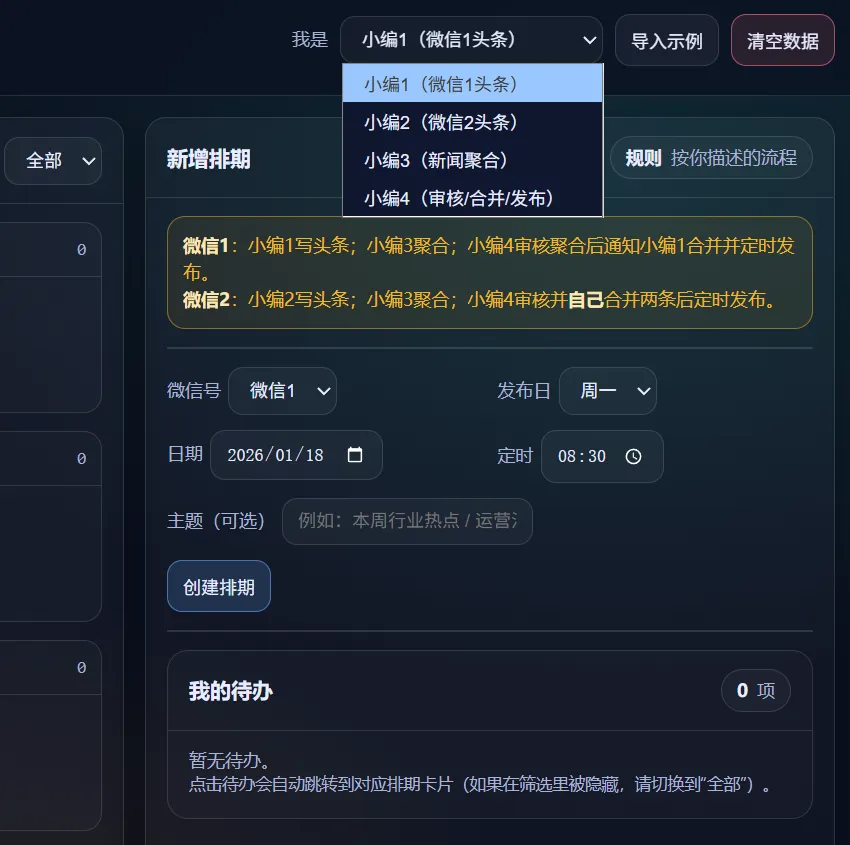 使用的时候,需要先创建排期,创建好以后,则在左边能看到一个进行中的任务。在面板中,选择不同的身份,在我的待办中,会显示要做的事情。