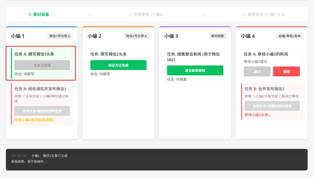 小编1写完头条以后,系统就会等着小编4来审核新闻。并且小编4需要等到小编3提交新闻后,才能点击通过审核。