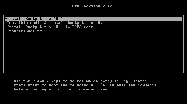 第2步,在服务器的启动选项中设置从ISO文件启动,启动后进入如图所示的欢迎界面,安装菜单选项如下表所示,这里我们选择“Install Rocky Linux 10.1”安装选项,并按“回车”键。