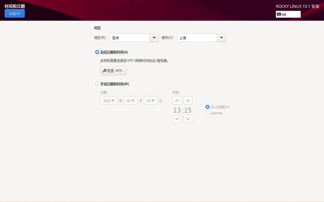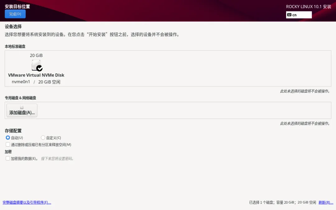 (1)安装目标位置:点击“安装目标位置”将选择将Linux系统安装到哪个盘。在“安装目标位置”界面,选择对应的磁盘,磁盘存储配置默认为“自动”分区,此时单击“完成”按钮即可