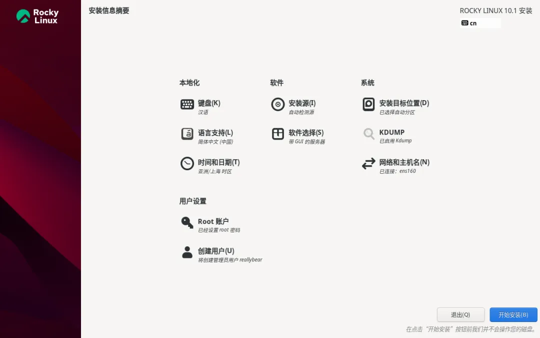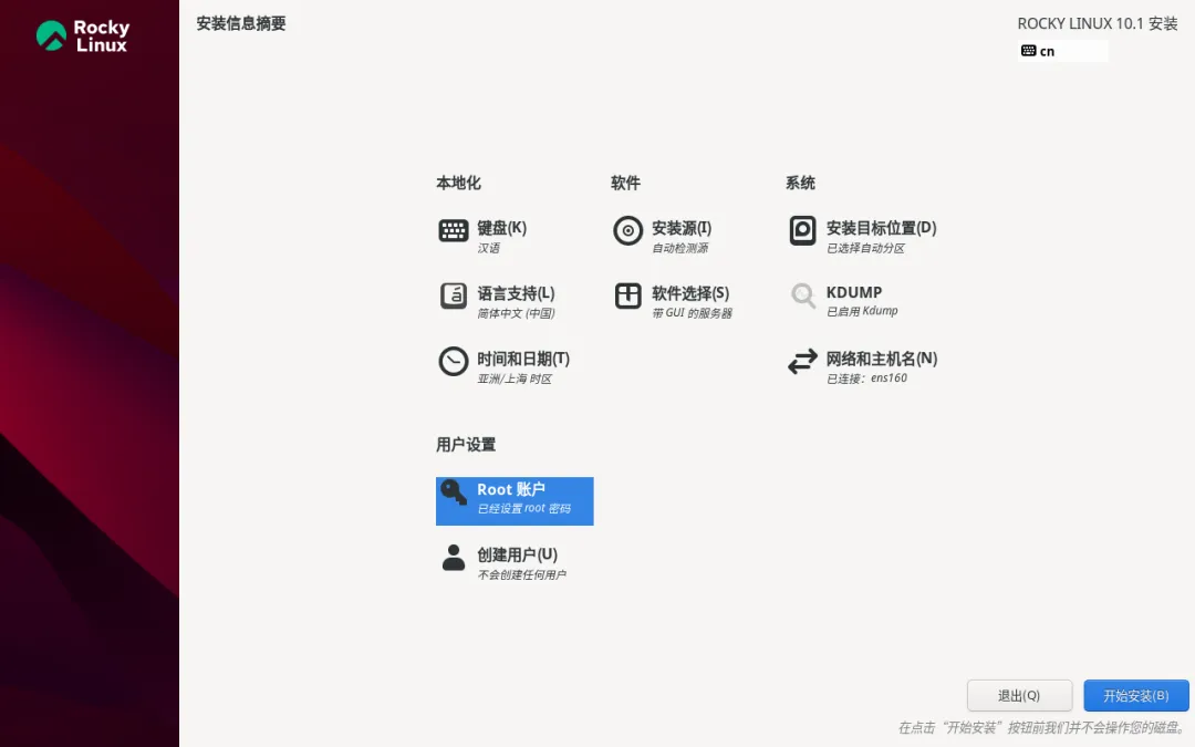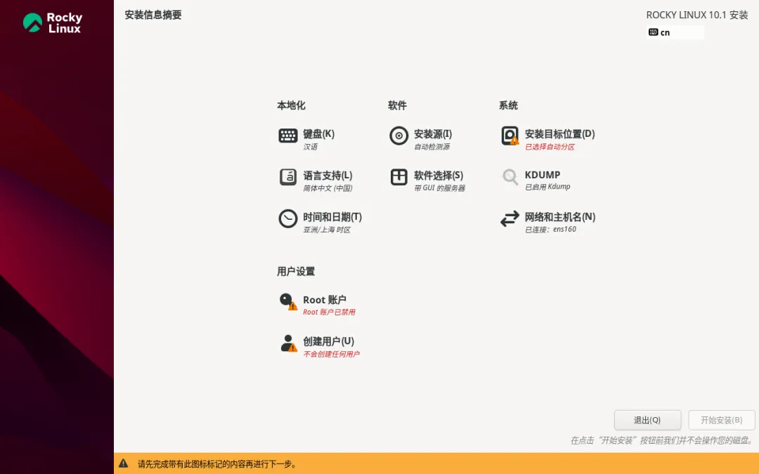 用于定制和更改目标系统的基础硬件。 这是您创建硬盘驱动器分区或卷的地方,指定要使用的文件系统。 指定网络配置,启用或禁用 KDUMP,或选择一个安全配置文件。 | |